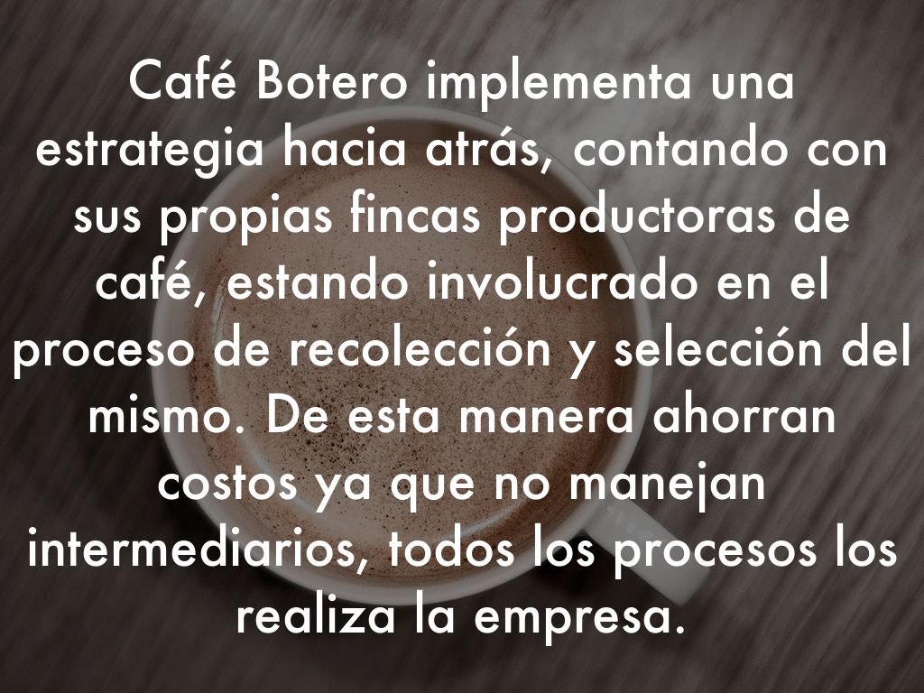 Café Botero implementa una estrategia hacia atrás, contando con sus propias fincas productoras de café, estando involucrado en el proceso de recolección y selección del mismo. De esta manera ahorran costos ya que no manejan intermediarios, todos los procesos los realiza la empresa.