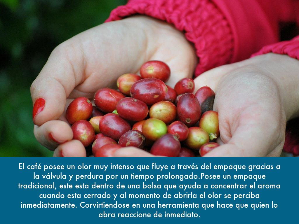 El café posee un olor muy intenso que fluye a través del empaque gracias a la válvula y perdura por un tiempo prolongado.Posee un empaque tradicional, este esta dentro de una bolsa que ayuda a concentrar el aroma cuando esta cerrado y al momento de abrirla el olor se perciba inmediatamente. Corvirtiendose en una herramienta que hace que quien lo abra reaccione de inmediato.