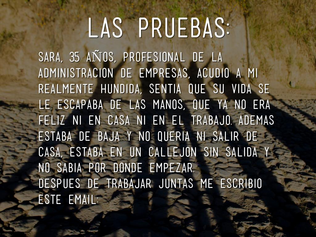 • SARA, 35 AÑOS, PROFESIONAL DE LA ADMINISTRACION DE EMPRESAS, ACUDIO A MI REALMENTE HUNDIDA, SENTIA QUE SU VIDA SE LE ESCAPABA DE LAS MANOS, QUE YA NO ERA FELIZ NI EN CASA NI EN EL TRABAJO. ADEMAS ESTABA DE BAJA Y NO QUERIA NI SALIR DE CASA, ESTABA EN UN CALLEJON SIN SALIDA Y NO SABIA POR DONDE EMPEZAR. DESPUES DE TRABAJAR JUNTAS ME ESCRIBIO ESTE EMAIL: