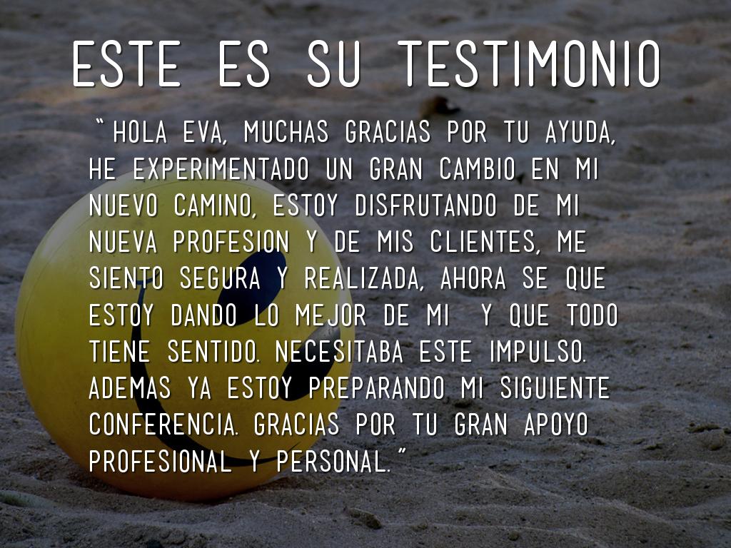 • “HOLA EVA, MUCHAS GRACIAS POR TU AYUDA, HE EXPERIMENTADO UN GRAN CAMBIO EN MI NUEVO CAMINO, ESTOY DISFRUTANDO DE MI NUEVA PROFESION Y DE MIS CLIENTES, ME SIENTO SEGURA Y REALIZADA, AHORA SE QUE ESTOY DANDO LO MEJOR DE MI Y QUE TODO TIENE SENTIDO. NECESITABA ESTE IMPULSO. ADEMAS YA ESTOY PREPARANDO MI SIGUIENTE CONFERENCIA. GRACIAS POR TU GRAN APOYO PROFESIONAL Y PERSONAL.”