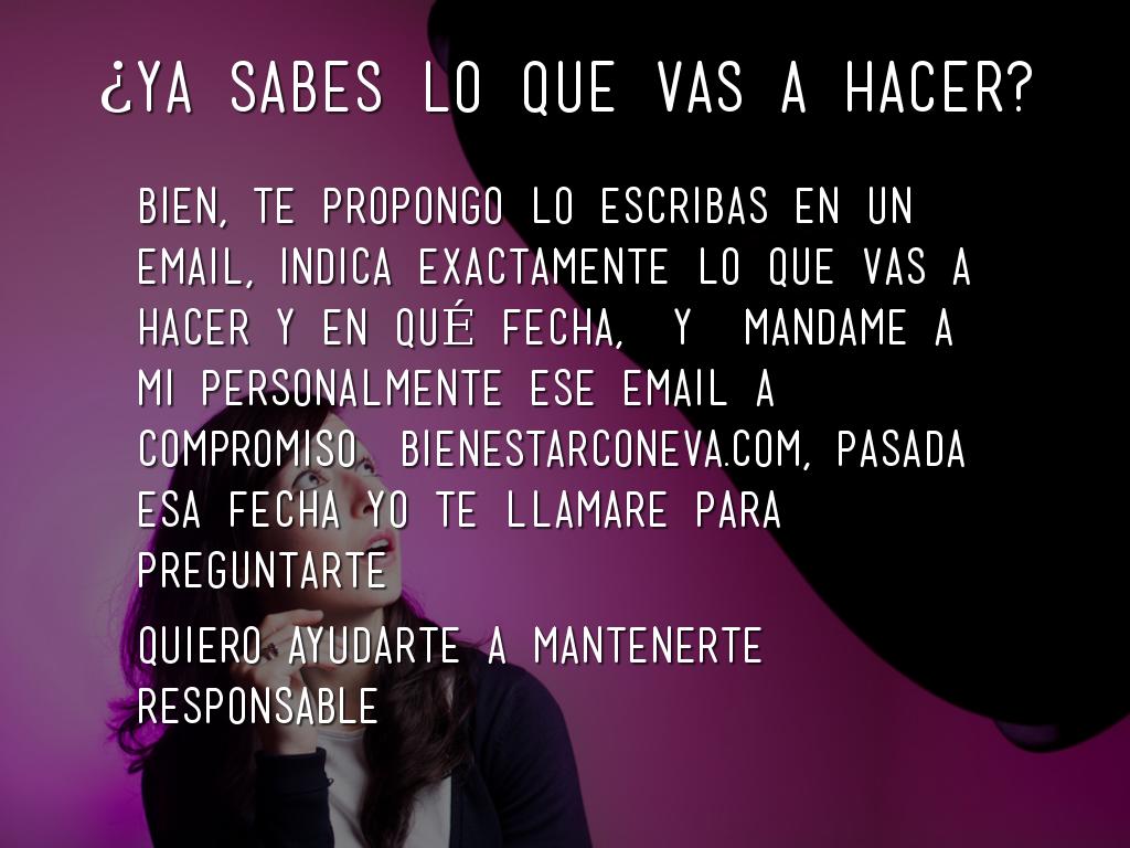 • BIEN, TE PROPOnGO LO ESCRIBAS EN UN EMAIL, INDICA EXACTAMENTE LO QUE VAS A HACER Y EN QUÉ FECHA, Y MaNDAME A MI PERSONALMENTE ESE EMAIL a compromiso@bienestarconeva.com, PASADA ESA FECHA YO TE LLAMARe PARA PREGUNTARTE