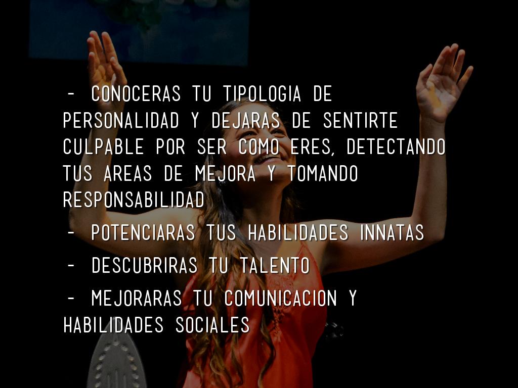 • - CONOCERAS TU TIPOLOGIA DE PERSONALIDAD Y DEJARAS DE SENTIRTE CULPABLE POR SER COMO ERES, DETECTANDO TUS AREAS DE MEJORA Y TOMANDO RESPONSABILIDAD