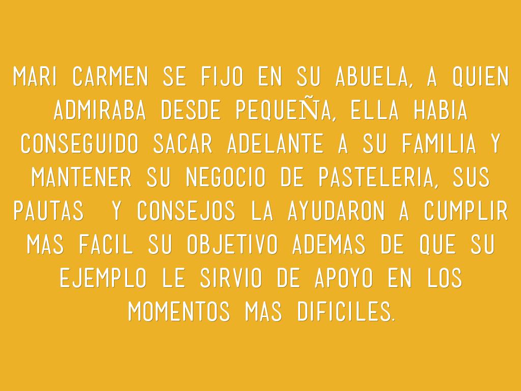 MARI CARMEN SE FIJO EN SU ABUELA, A QUIEN ADMIRABA DESDE PEQUEÑA, ELLA HABIA CONSEGUIDO SACAR ADELANTE A SU FAMILIA Y MANTENER SU NEGOCIO DE PASTELERIA, SUS PAUTAS Y CONSEJOS LA AYUDARON A CUMPLIR MAS FACIL SU OBJETIVO ADEMAS DE QUE SU EJEMPLO LE SIRVIO DE APOYO EN LOS MOMENTOS MAS DIFICILES.