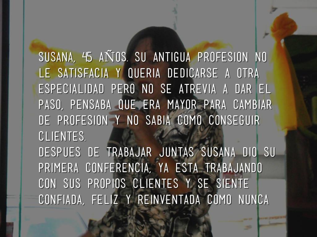 • SUSANA, 45 AÑOS. SU ANTIGUA PROFESION NO LE SATISFACIA Y QUERIA DEDICARSE A OTRA ESPECIALIDAD PERO NO SE ATREVIA A DAR EL PASO, PENSABA QUE ERA MAYOR PARA CAMBIAR DE PROFESION Y NO SABIA COMO CONSEGUIR CLIENTES. DESPUES DE TRABAJAR JUNTAS SUSANA DIO SU PRIMERA CONFERENCIA, YA ESTA TRABAJANDO CON SUS PROPIOS CLIENTES Y SE SIENTE CONFIADA, FELIZ Y REINVENTADA COMO NUNCA ANTES.