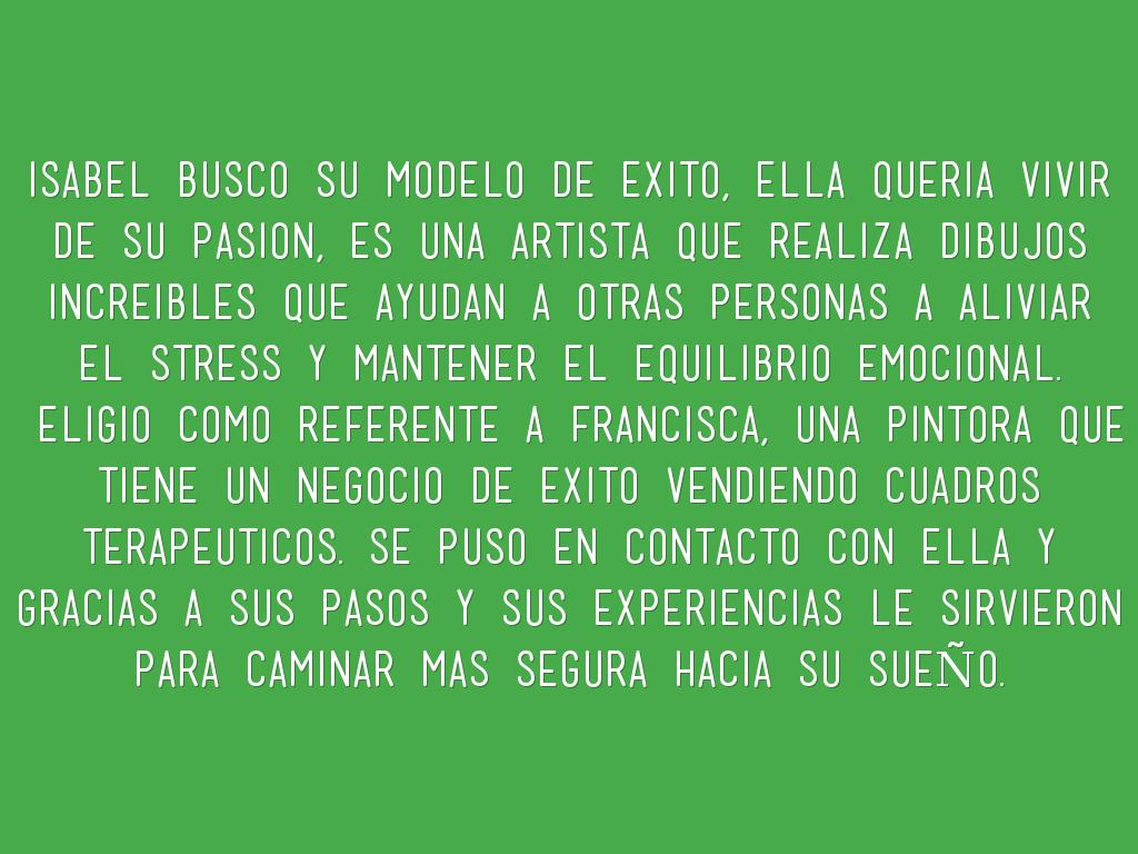 ISABEL BUSCO SU MODELO DE EXITO, ELLA QUERIA VIVIR DE SU PASION, ES UNA ARTISTA QUE REALIZA DIBUJOS INCREIBLES QUE AYUDAN A OTRAS PERSONAS A ALIVIAR EL STRESS Y MANTENER EL EQUILIBRIO EMOCIONAL. ELIGIO COMO REFERENTE A FRANCISCA, UNA PINTORA QUE TIENE UN NEGOCIO DE EXITO VENDIENDO CUADROS TERAPEUTICOS. SE PUSO EN CONTACTO CON ELLA Y GRACIAS A SUS PASOS Y SUS EXPERIENCIAS LE SIRVIERON PARA CAMINAR MAS SEGURA HACIA SU SUEÑO.