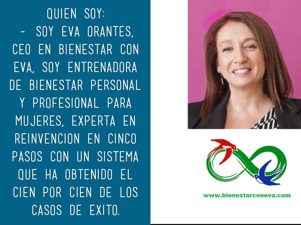 - SOY EVA ORANTES, CEO EN BIENESTAR CON EVA, SOY ENTRENADORA DE BIENESTAR PERSONAL Y PROFESIONAL PARA MUJERES, EXPERTA EN REINVENCION EN CINCO PASOS CON UN SISTEMA QUE HA OBTENIDO EL CIEN por cien DE LOS CASOS DE EXITO.