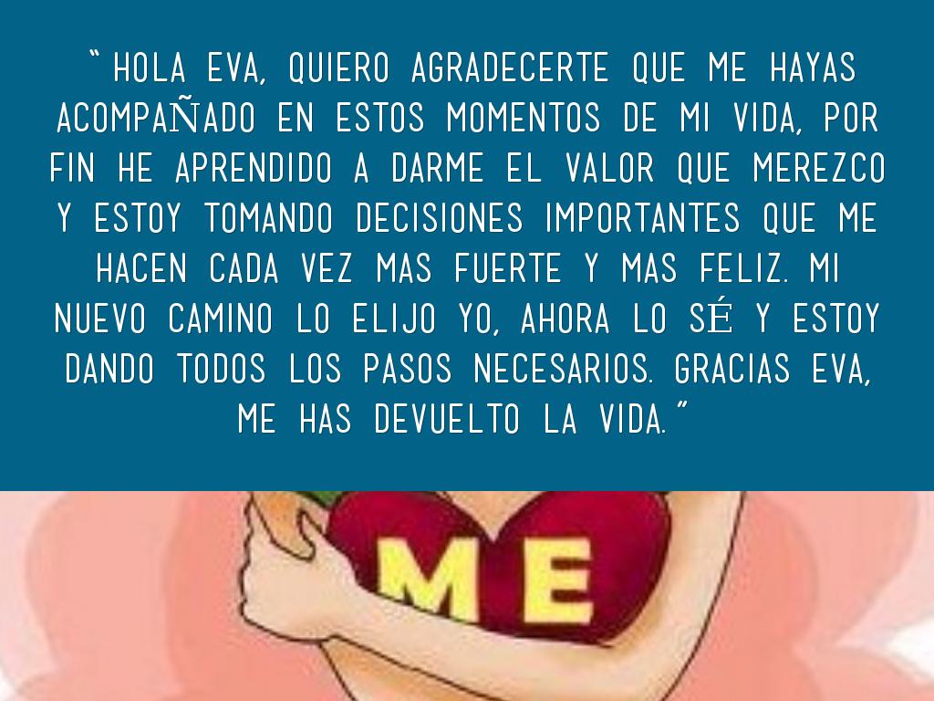 “HOLA EVA, QUIERO AGRADECERTE QUE ME HAYAS ACOMPAÑADO EN ESTOS MOMENTOS DE MI VIDA, POR FIN HE APRENDIDO A DARME EL VALOR QUE MEREZCO Y ESTOY TOMANDO DECISIONES IMPORTANTES QUE ME HACEN CADA VEZ MAS FUERTE Y MAS FELIZ. MI NUEVO CAMINO LO ELIJO YO, AHORA LO SÉ Y ESTOY DANDO TODOS LOS PASOS NECESARIOS. GRACIAS EVA, ME HAS DEVUELTO LA VIDA.”