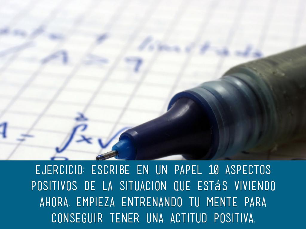 EJERCICIO: Escribe en un papel 10 aspectos positivos de la situaciOn que estás viviendo ahora. Empieza entrenando tu mente para conseguir tener una actitud positiva.