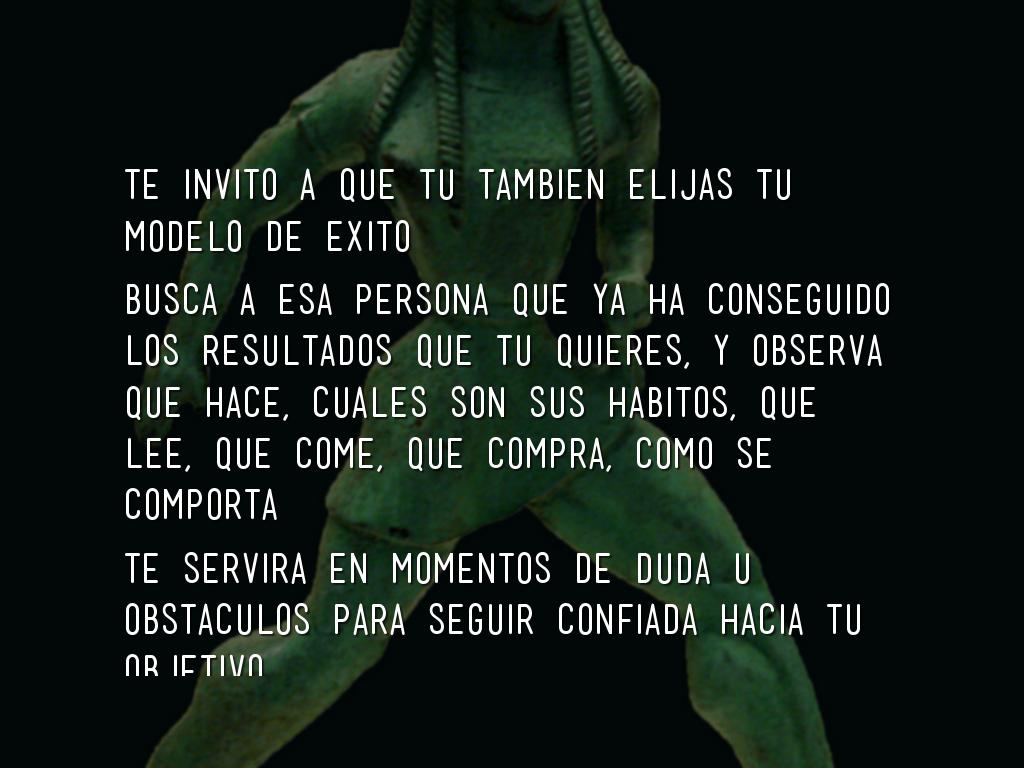 • BUSCA A ESA PERSONA QUE YA HA CONSEGUIDO LOS RESULTADOS QUE TU QUIERES, Y OBSERVA QUE HACE, CUALES SON SUS HABITOS, QUE LEE, QUE COME, QUE COMPRA, COMO SE COMPORTA …
