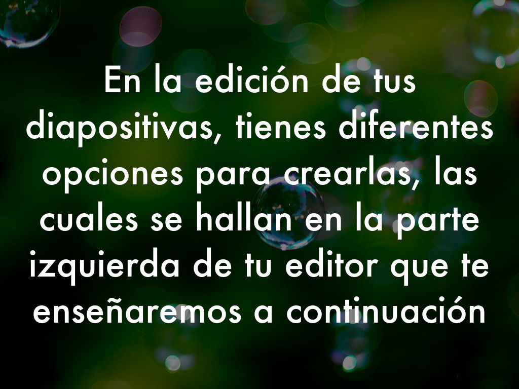 En la edición de tus diapositivas, tienes diferentes opciones para crearlas, las cuales se hallan en la parte izquierda de tu editor que te enseñaremos a continuación