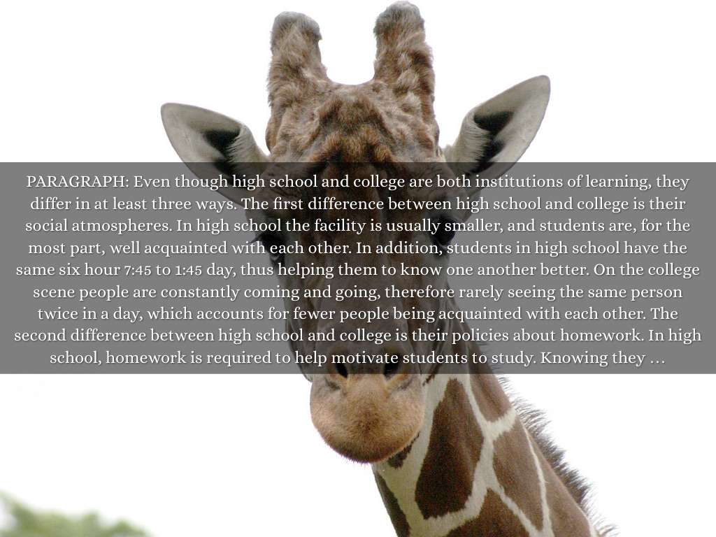PARAGRAPH: Even though high school and college are both institutions of learning, they differ in at least three ways. The first difference between high school and college is their social atmospheres. In high school the facility is usually smaller, and students are, for the most part, well acquainted with each other. In addition, students in high school have the same six hour 7:45 to 1:45 day, thus helping them to know one another better. On the college scene people are constantly coming and going, therefore rarely seeing the same person twice in a day, which accounts for fewer people being acquainted with each other. The second difference between high school and college is their policies about homework. In high school, homework is required to help motivate students to study. Knowing they have to submit assignments in algebra or history gives students an incentive to keep up with these subjects. In college most homework consists of studying; very little of it is written and turned in. If students do their homework, it is to their advantage; if they do not, the teachers will not force them to do it. The student is only wasting his own money if he neglects his course work. The third and last difference between high school and college is their attendance policies. In high school, students must attend class to get assignments and personal help in a certain area. Furthermore, high school students are less responsible; therefore, they need more guidance, which they can receive by going to class. In college, students may skip classes if they choose and refer to the syllabus to acquire missed assignments or tests. It is the student’s responsibility to make work up. In spite of these differences between high school and college, they both serve the same purpose -- to prepare an individual for the real world.