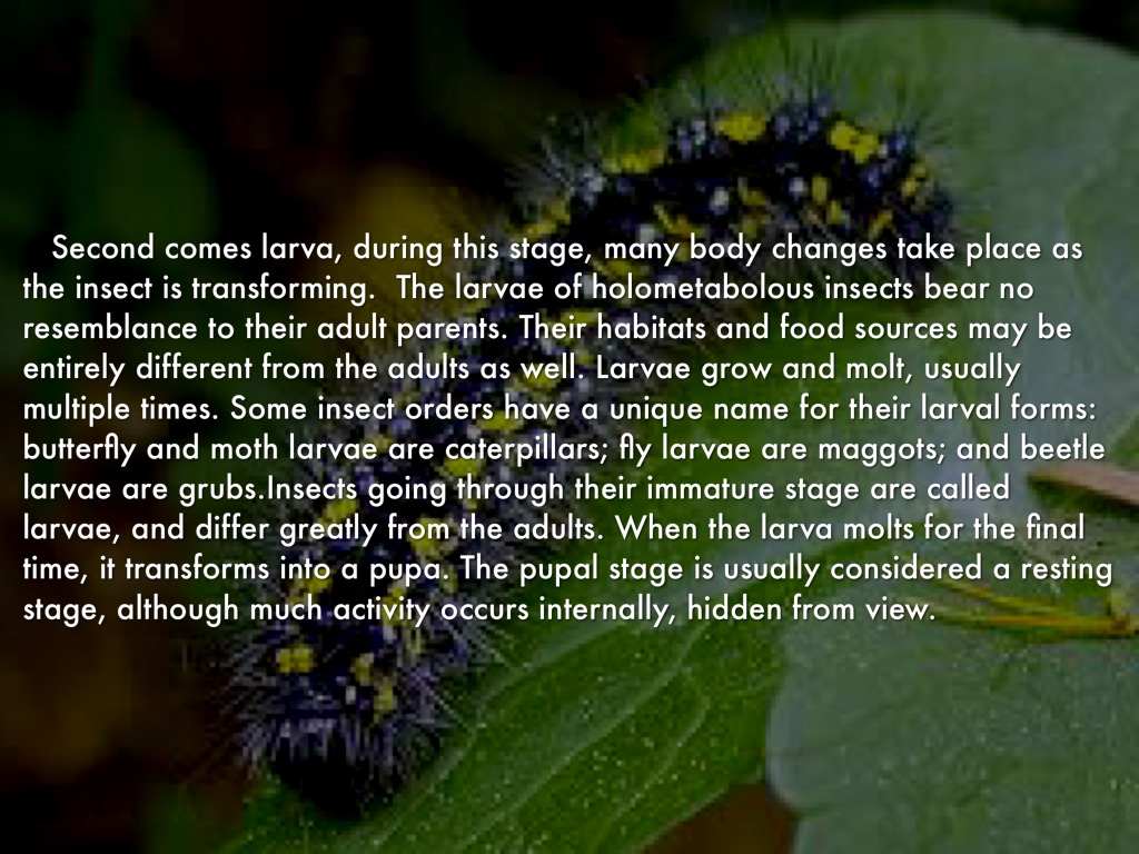 Second comes larva, during this stage, many body changes take place as the insect is transforming. The larvae of holometabolous insects bear no resemblance to their adult parents. Their habitats and food sources may be entirely different from the adults as well. Larvae grow and molt, usually multiple times. Some insect orders have a unique name for their larval forms: butterfly and moth larvae are caterpillars; fly larvae are maggots; and beetle larvae are grubs.Insects going through their immature stage are called larvae, and differ greatly from the adults. When the larva molts for the final time, it transforms into a pupa. The pupal stage is usually considered a resting stage, although much activity occurs internally, hidden from view.