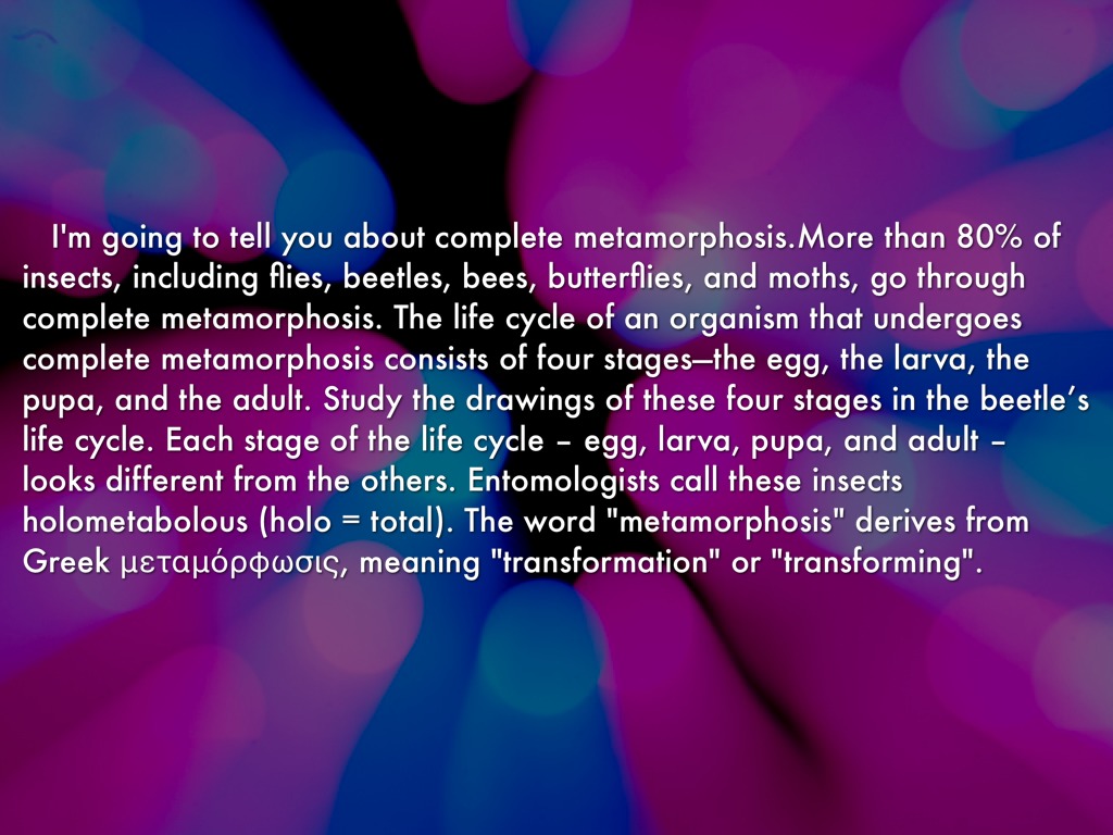 I'm going to tell you about complete metamorphosis.More than 80% of insects, including flies, beetles, bees, butterflies, and moths, go through complete metamorphosis. The life cycle of an organism that undergoes complete metamorphosis consists of four stages—the egg, the larva, the pupa, and the adult. Study the drawings of these four stages in the beetle’s life cycle. Each stage of the life cycle – egg, larva, pupa, and adult – looks different from the others. Entomologists call these insects holometabolous (holo = total). The word "metamorphosis" derives from Greek μεταμόρφωσις, meaning "transformation" or "transforming".