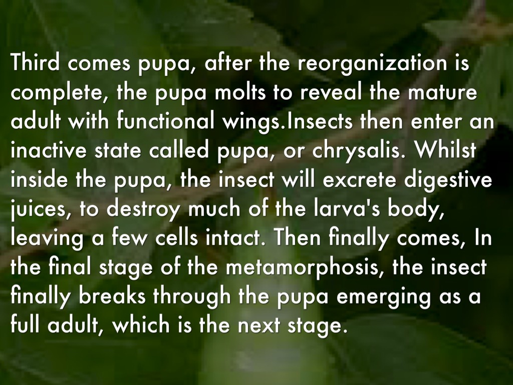 Third comes pupa, after the reorganization is complete, the pupa molts to reveal the mature adult with functional wings.Insects then enter an inactive state called pupa, or chrysalis. Whilst inside the pupa, the insect will excrete digestive juices, to destroy much of the larva's body, leaving a few cells intact. Then finally comes, In the final stage of the metamorphosis, the insect finally breaks through the pupa emerging as a full adult, which is the next stage.