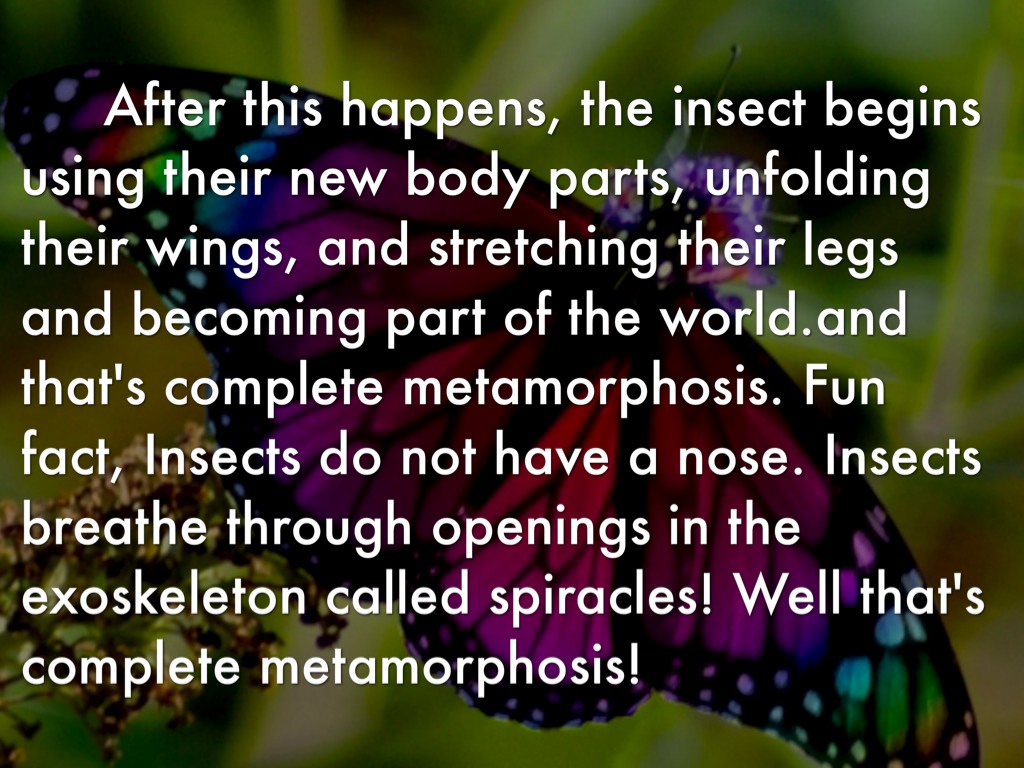 After this happens, the insect begins using their new body parts, unfolding their wings, and stretching their legs and becoming part of the world.and that's complete metamorphosis. Fun fact, Insects do not have a nose. Insects breathe through openings in the exoskeleton called spiracles! Well that's complete metamorphosis!
