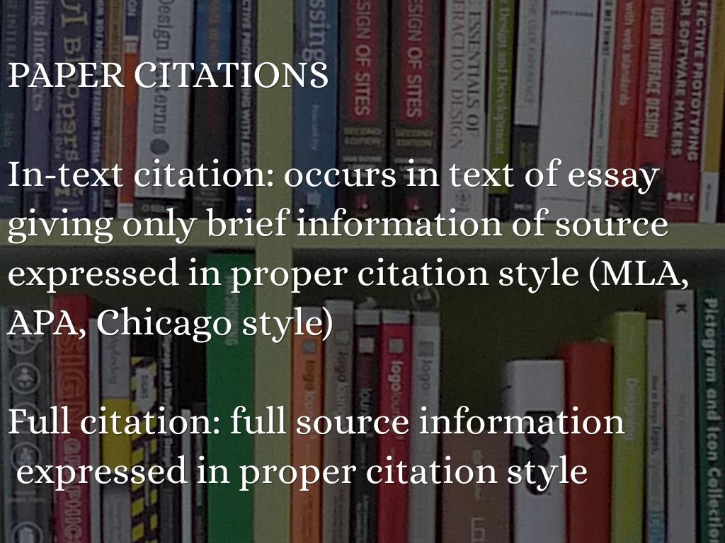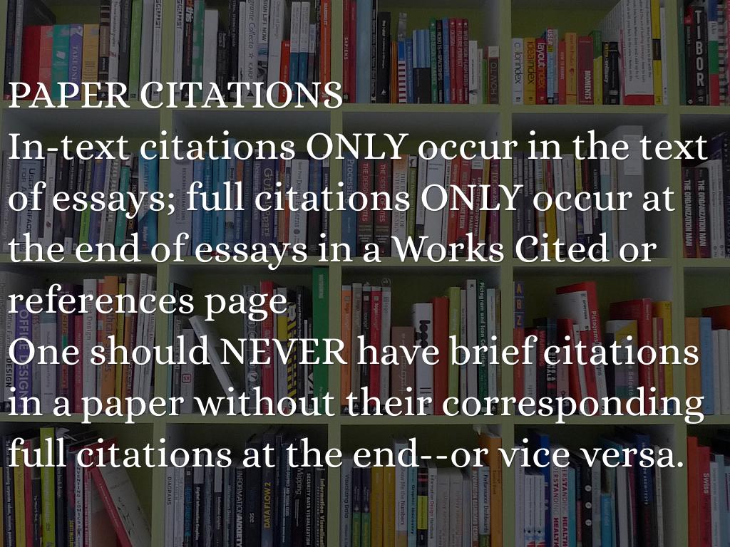 PAPER CITATIONS In-text citations ONLY occur in the text of essays; full citations ONLY occur at the end of essays in a Works Cited or references page One should NEVER have brief citations in a paper without their corresponding full citations at the end--or vice versa.