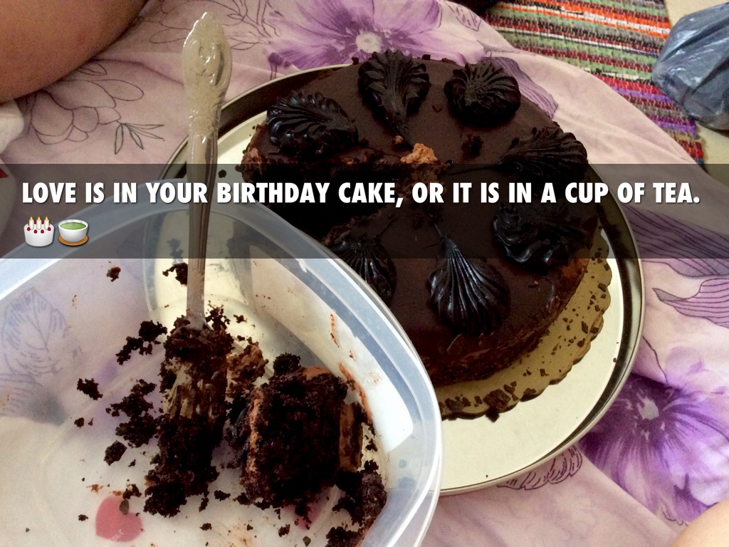 LOVE IS IN YOUR BIRTHDAY CAKE, OR IT IS IN A CUP OF TEA.