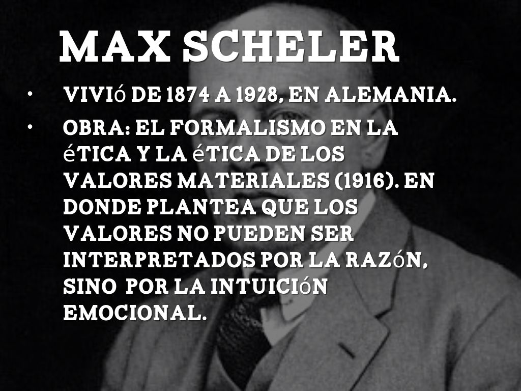 Obra: El formalismo en la ética y la ética de los valores materiales (1916). en donde plantea que los valores no pueden ser interpretados por la razón, sino por la intuición emocional.