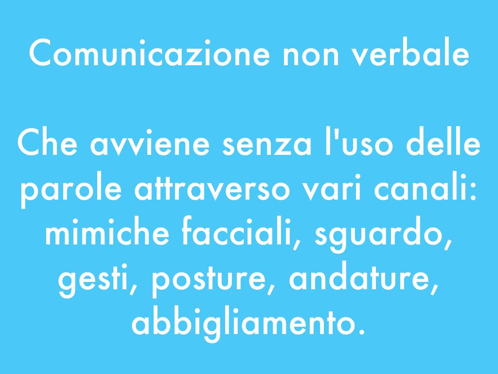 Che avviene senza l'uso delle parole attraverso vari canali: mimiche facciali, sguardo, gesti, posture, andature, abbigliamento.