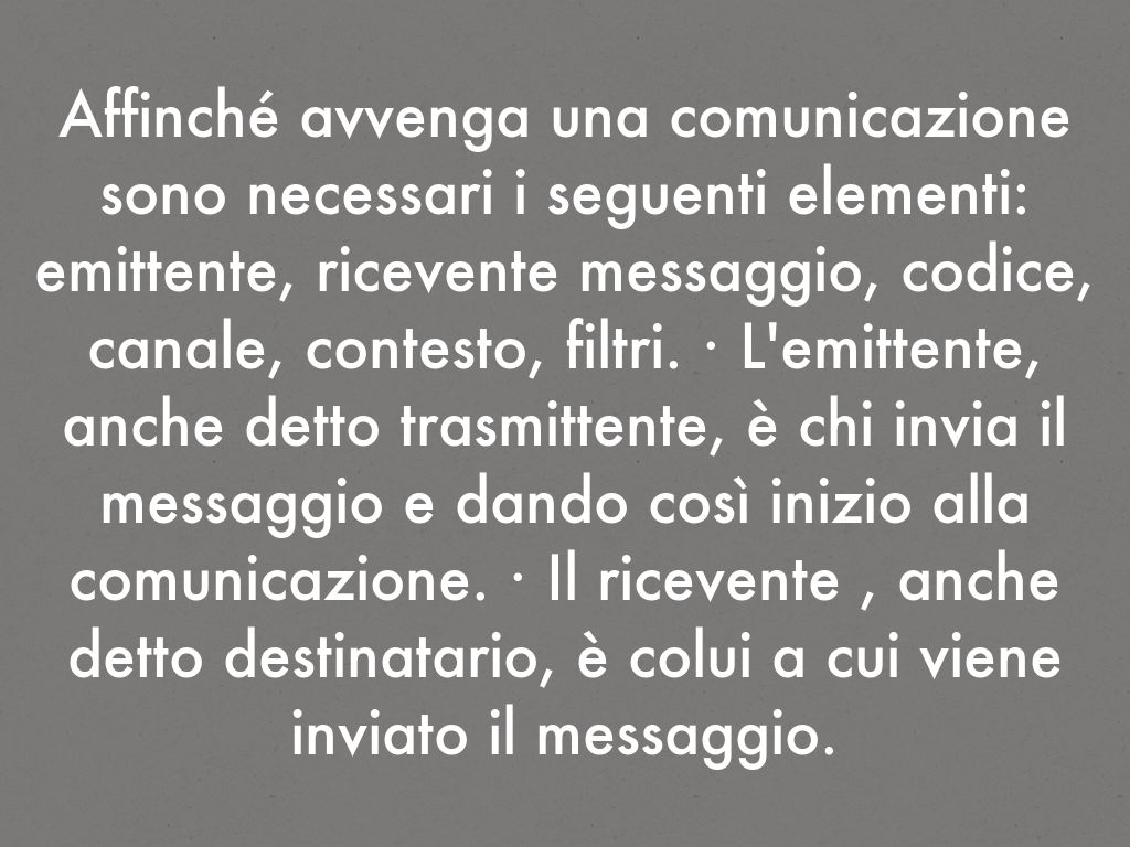 Affinché avvenga una comunicazione sono necessari i seguenti elementi: emittente, ricevente messaggio, codice, canale, contesto, filtri. · L'emittente, anche detto trasmittente, è chi invia il messaggio e dando così inizio alla comunicazione. · Il ricevente , anche detto destinatario, è colui a cui viene inviato il messaggio.