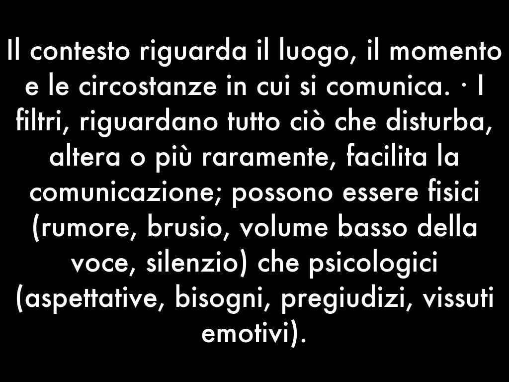 Il contesto riguarda il luogo, il momento e le circostanze in cui si comunica. · I filtri, riguardano tutto ciò che disturba, altera o più raramente, facilita la comunicazione; possono essere fisici (rumore, brusio, volume basso della voce, silenzio) che psicologici (aspettative, bisogni, pregiudizi, vissuti emotivi).