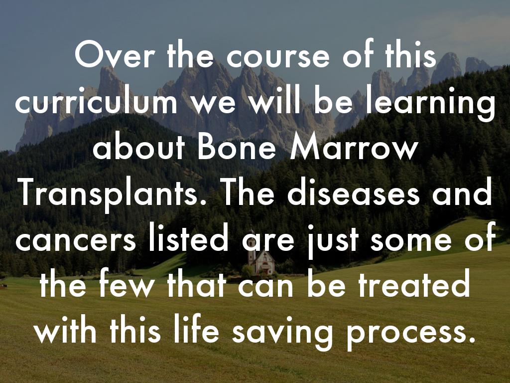 Over the course of this curriculum we will be learning about Bone Marrow Transplants. The diseases and cancers listed are just some of the few that can be treated with this life saving process.