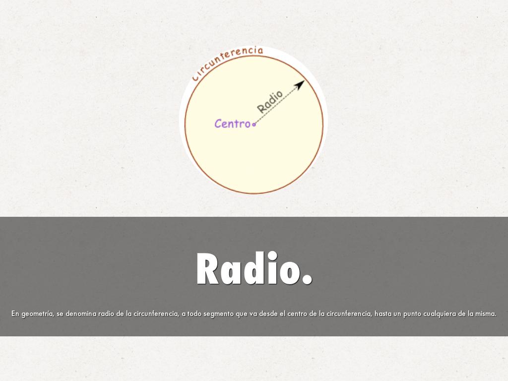 En geometría, se denomina radio de la circunferencia, a todo segmento que va desde el centro de la circunferencia, hasta un punto cualquiera de la misma.
