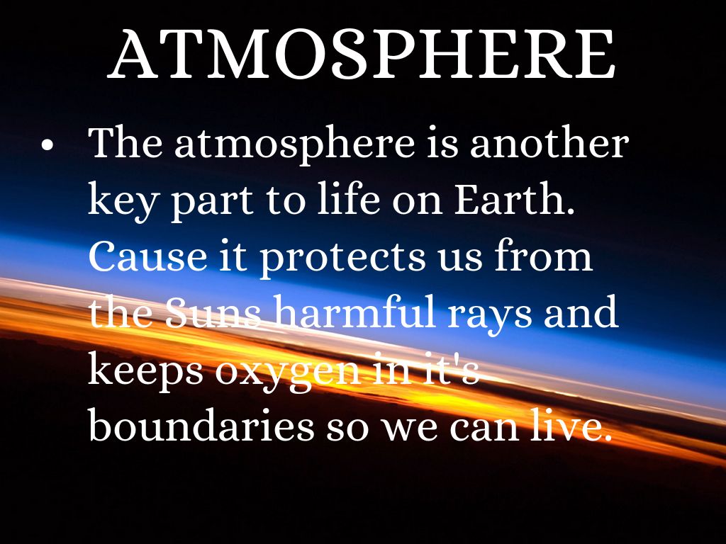 The atmosphere is another key part to life on Earth. Cause it protects us from the Suns harmful rays and keeps oxygen in it's boundaries so we can live.