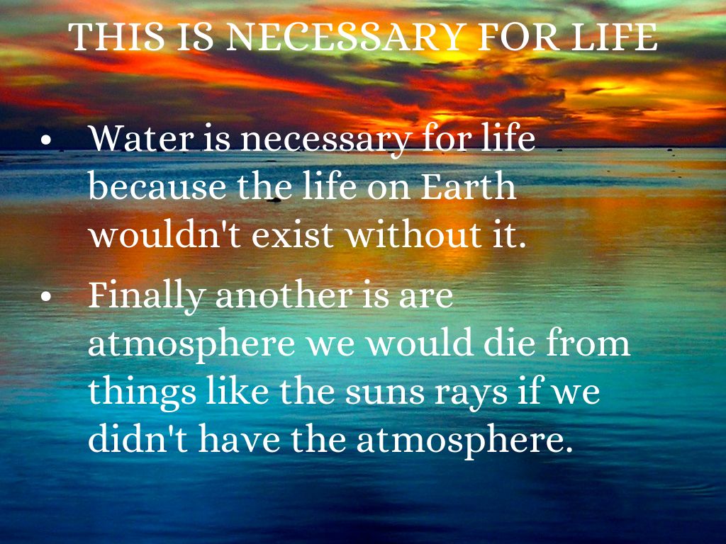 Finally another is are atmosphere we would die from things like the suns rays if we didn't have the atmosphere.