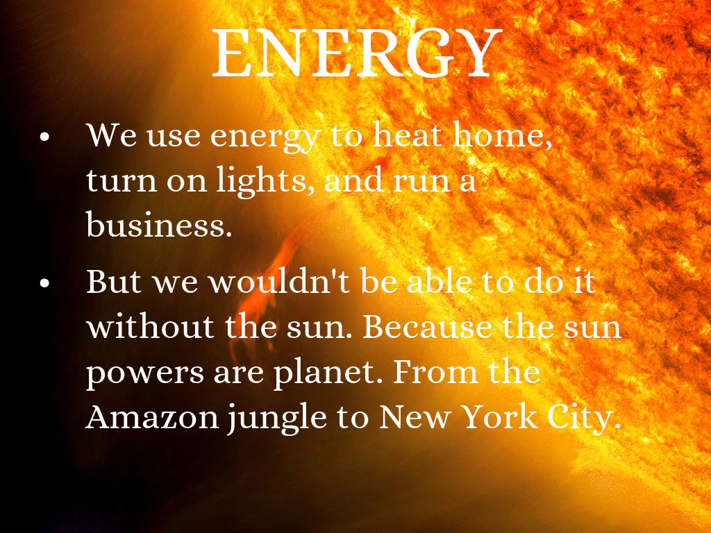 But we wouldn't be able to do it without the sun. Because the sun powers are planet. From the Amazon jungle to New York City.