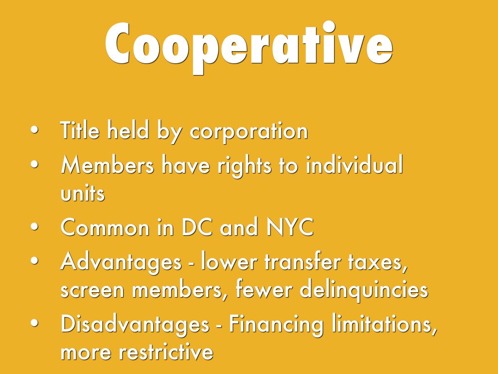 Advantages - lower transfer taxes, screen members, fewer delinquincies