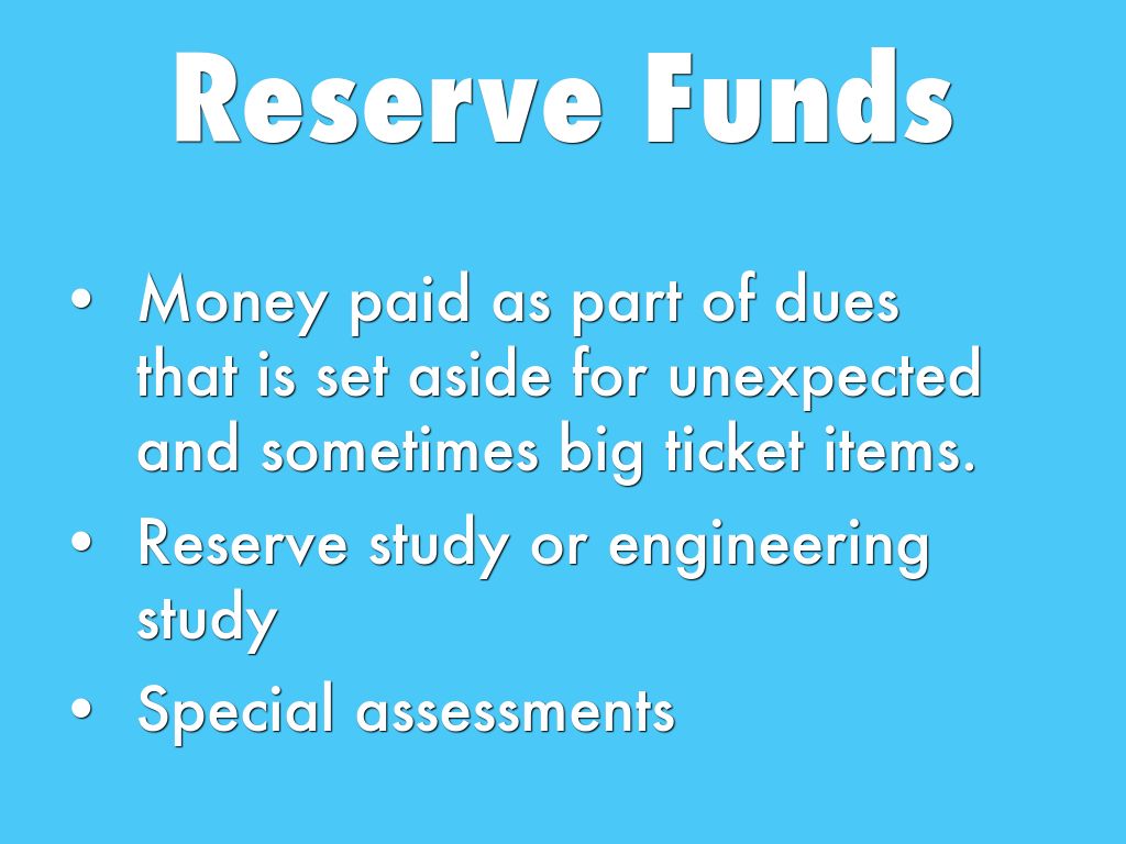 Money paid as part of dues that is set aside for unexpected and sometimes big ticket items.