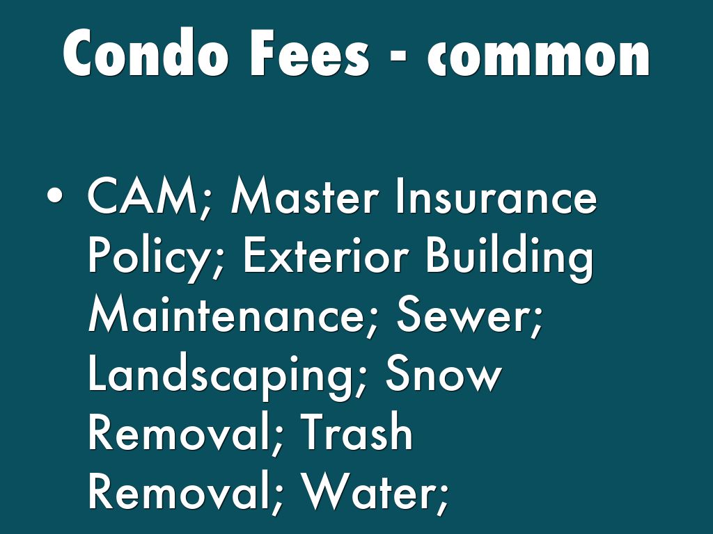 CAM; Master Insurance Policy; Exterior Building Maintenance; Sewer; Landscaping; Snow Removal; Trash Removal; Water;