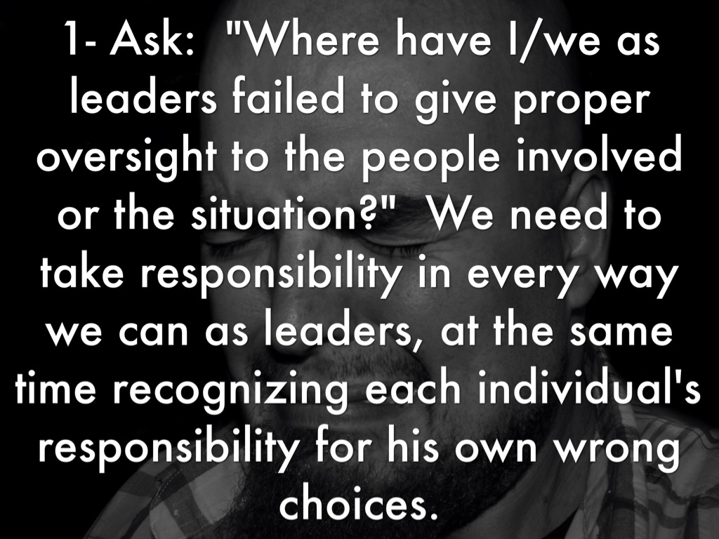 1- Ask: "Where have I/we as leaders failed to give proper oversight to the people involved or the situation?" We need to take responsibility in every way we can as leaders, at the same time recognizing each individual's responsibility for his own wrong choices.