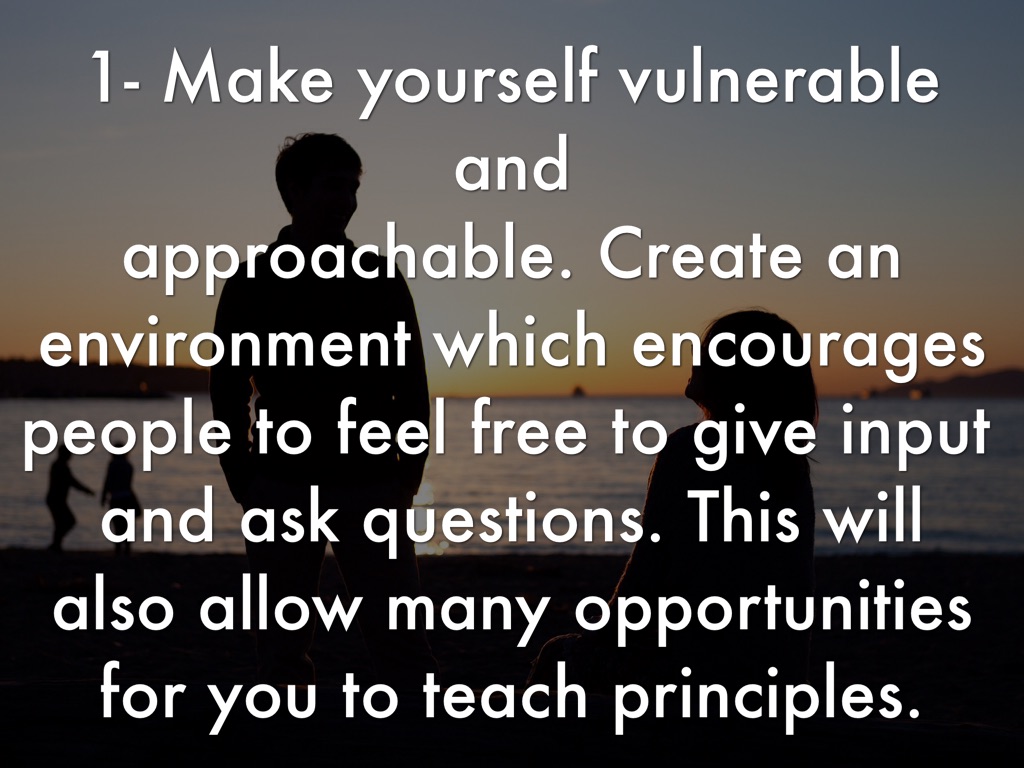 1- Make yourself vulnerable and approachable. Create an environment which encourages people to feel free to give input and ask questions. This will also allow many opportunities for you to teach principles.