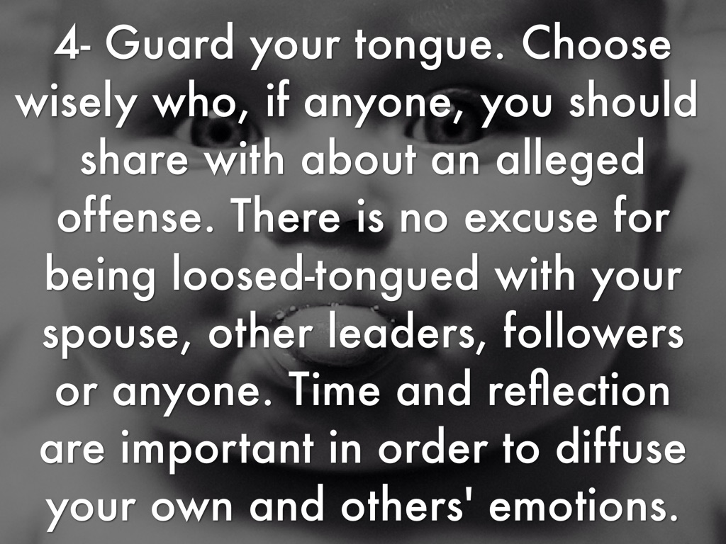 4- Guard your tongue. Choose wisely who, if anyone, you should share with about an alleged offense. There is no excuse for being loosed-tongued with your spouse, other leaders, followers or anyone. Time and reflection are important in order to diffuse your own and others' emotions.