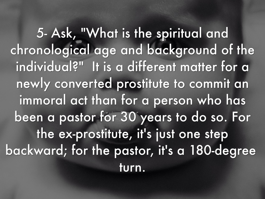 5- Ask, "What is the spiritual and chronological age and background of the individual?" It is a different matter for a newly converted prostitute to commit an immoral act than for a person who has been a pastor for 30 years to do so. For the ex-prostitute, it's just one step backward; for the pastor, it's a 180-degree turn.