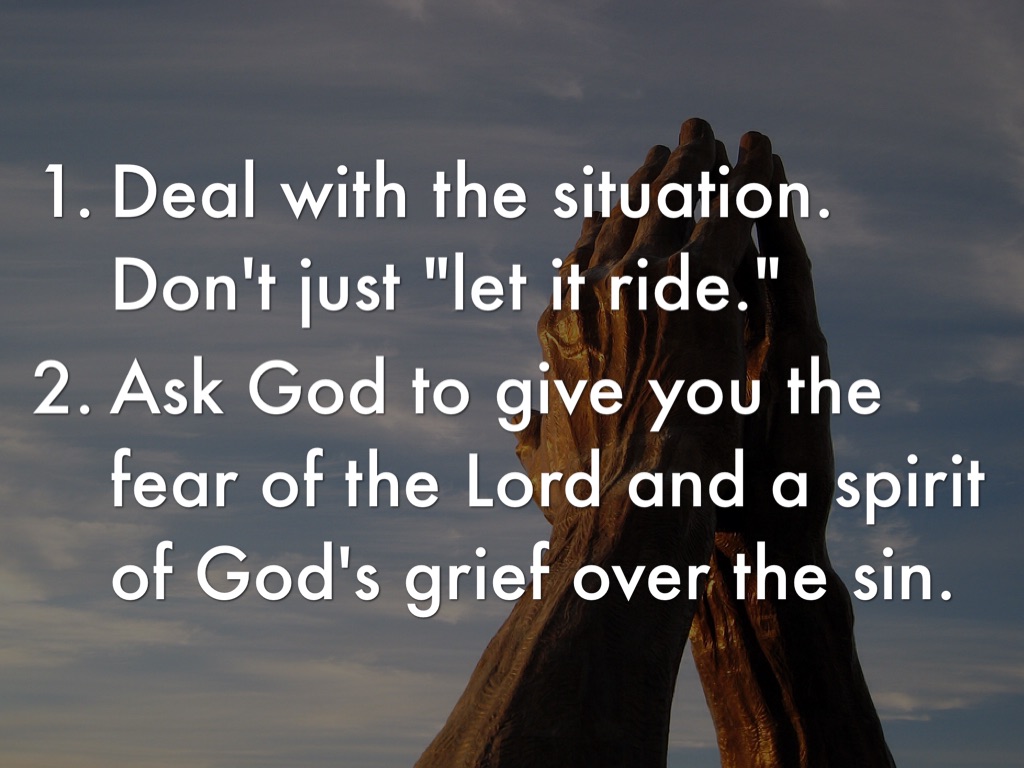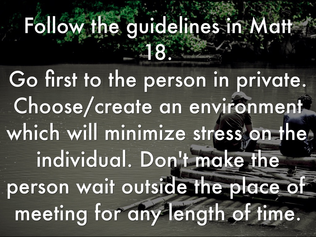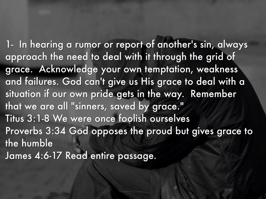1- In hearing a rumor or report of another's sin, always approach the need to deal with it through the grid of grace. Acknowledge your own temptation, weakness and failures. God can't give us His grace to deal with a situation if our own pride gets in the way. Remember that we are all "sinners, saved by grace." Titus 3:1-8 We were once foolish ourselves Proverbs 3:34 God opposes the proud but gives grace to the humble James 4:6-17 Read entire passage.