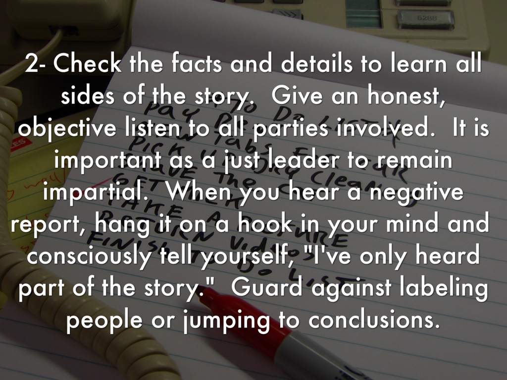 2- Check the facts and details to learn all sides of the story. Give an honest, objective listen to all parties involved. It is important as a just leader to remain impartial. When you hear a negative report, hang it on a hook in your mind and consciously tell yourself, "I've only heard part of the story." Guard against labeling people or jumping to conclusions.