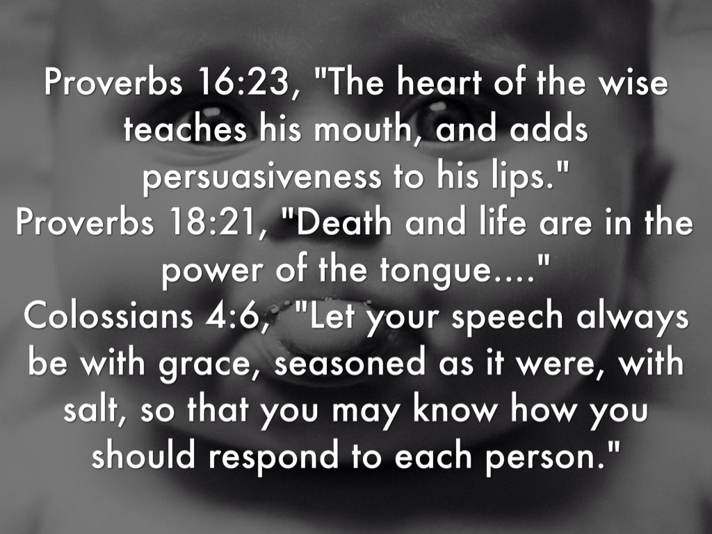 Proverbs 16:23, "The heart of the wise teaches his mouth, and adds persuasiveness to his lips." Proverbs 18:21, "Death and life are in the power of the tongue...." Colossians 4:6, "Let your speech always be with grace, seasoned as it were, with salt, so that you may know how you should respond to each person."
