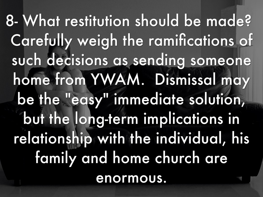 8- What restitution should be made? Carefully weigh the ramifications of such decisions as sending someone home from YWAM. Dismissal may be the "easy" immediate solution, but the long-term implications in relationship with the individual, his family and home church are enormous.