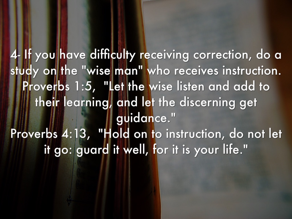 4- If you have difficulty receiving correction, do a study on the "wise man" who receives instruction. Proverbs 1:5, "Let the wise listen and add to their learning, and let the discerning get guidance." Proverbs 4:13, "Hold on to instruction, do not let it go: guard it well, for it is your life."