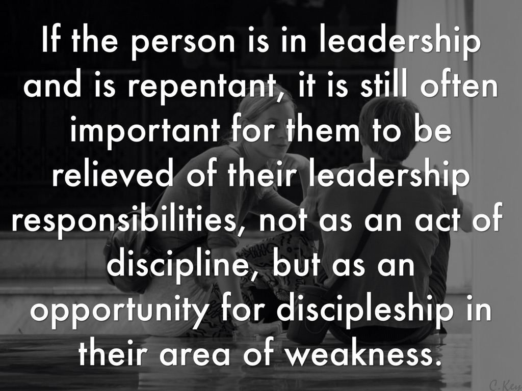 If the person is in leadership and is repentant, it is still often important for them to be relieved of their leadership responsibilities, not as an act of discipline, but as an opportunity for discipleship in their area of weakness.