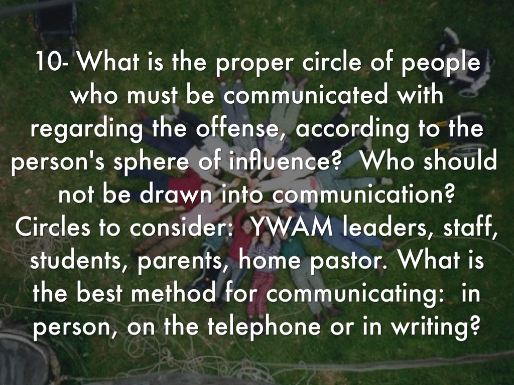 10- What is the proper circle of people who must be communicated with regarding the offense, according to the person's sphere of influence? Who should not be drawn into communication? Circles to consider: YWAM leaders, staff, students, parents, home pastor. What is the best method for communicating: in person, on the telephone or in writing?