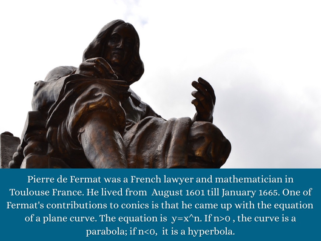 Pierre de Fermat was a French lawyer and mathematician in Toulouse France. He lived from August 1601 till January 1665. One of Fermat's contributions to conics is that he came up with the equation of a plane curve. The equation is y=x^n. If n>0 , the curve is a parabola; if n