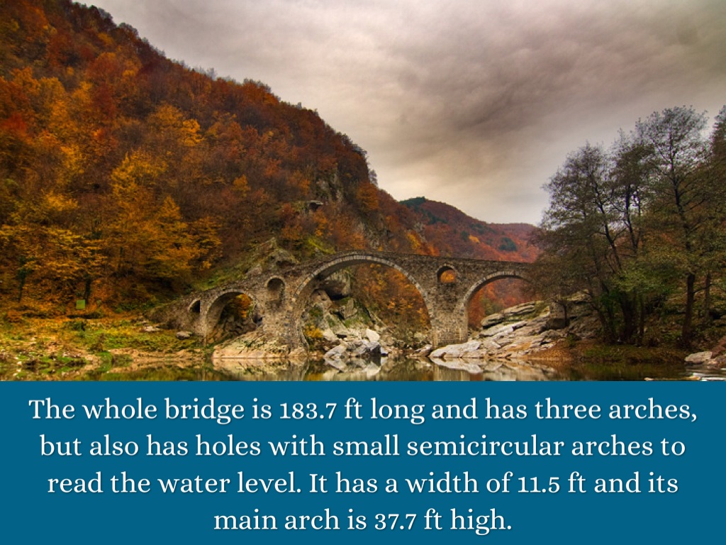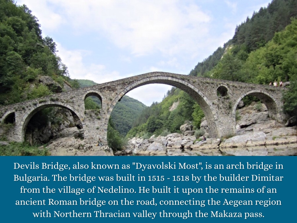 Devils Bridge, also known as "Dyavolski Most", is an arch bridge in Bulgaria. The bridge was built in 1515 - 1518 by the builder Dimitar from the village of Nedelino. He built it upon the remains of an ancient Roman bridge on the road, connecting the Aegean region with Northern Thracian valley through the Makaza pass.