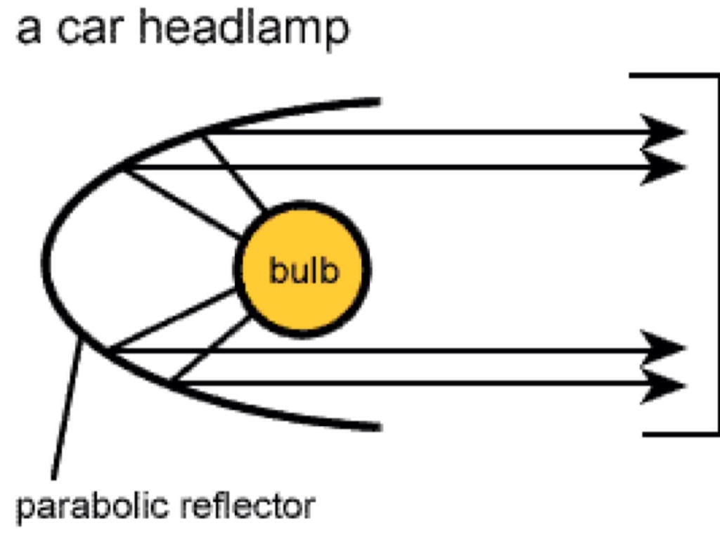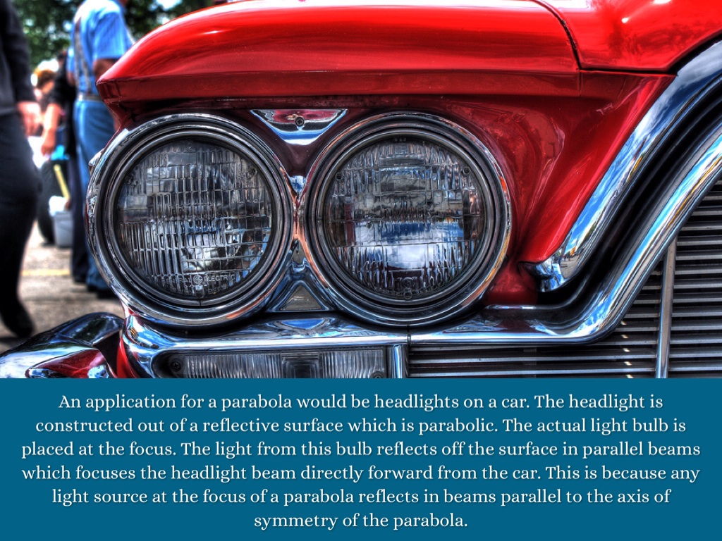 An application for a parabola would be headlights on a car. The headlight is constructed out of a reflective surface which is parabolic. The actual light bulb is placed at the focus. The light from this bulb reflects off the surface in parallel beams which focuses the headlight beam directly forward from the car. This is because any light source at the focus of a parabola reflects in beams parallel to the axis of symmetry of the parabola.