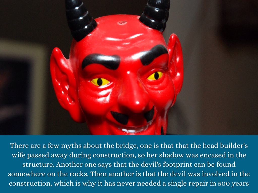 There are a few myths about the bridge, one is that that the head builder's wife passed away during construction, so her shadow was encased in the structure. Another one says that the devil's footprint can be found somewhere on the rocks. Then another is that the devil was involved in the construction, which is why it has never needed a single repair in 500 years