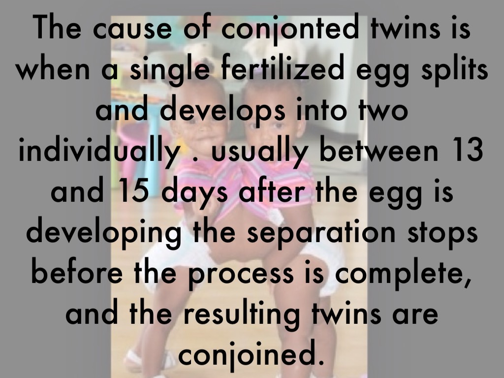 The cause of conjonted twins is when a single fertilized egg splits and develops into two individually . usually between 13 and 15 days after the egg is developing the separation stops before the process is complete, and the resulting twins are conjoined.