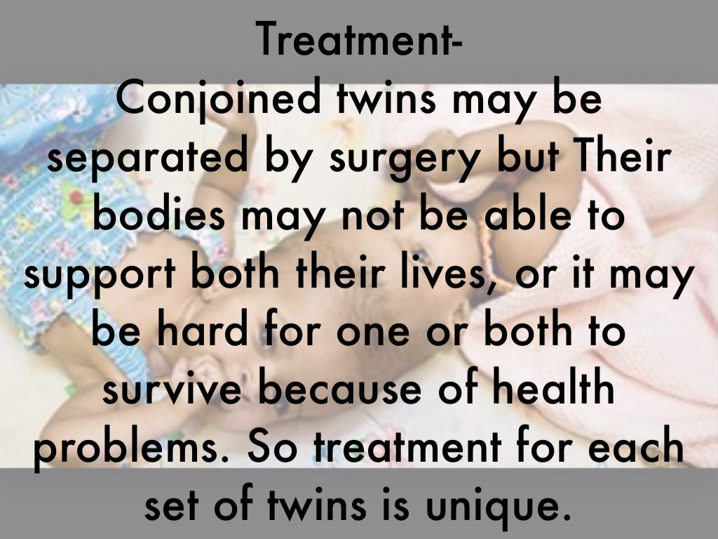 Conjoined twins may be separated by surgery but Their bodies may not be able to support both their lives, or it may be hard for one or both to survive because of health problems. So treatment for each set of twins is unique.
